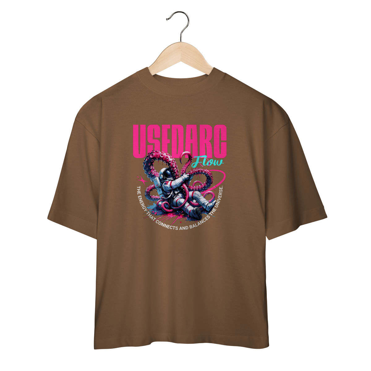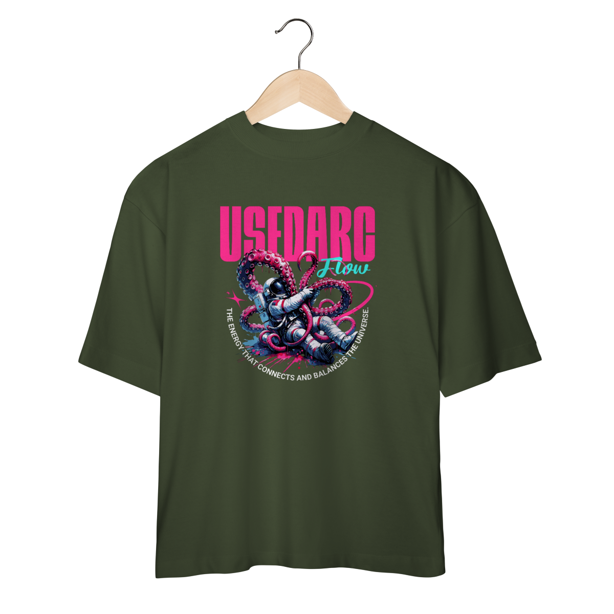 Entre no ritmo do universo com a Camiseta USEDARC Flow, uma arte vibrante que mistura ficção científica, cores neon e uma pegada psicodélica intensa. O astronauta preso aos tentáculos cósmicos cria uma sensação de movimento e energia, representando o fluxo que conecta e equilibra tudo ao redor.