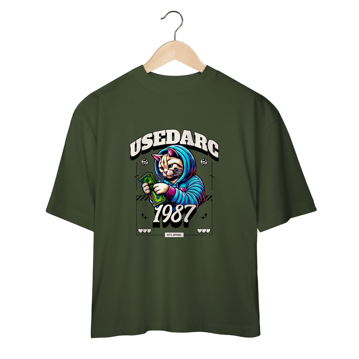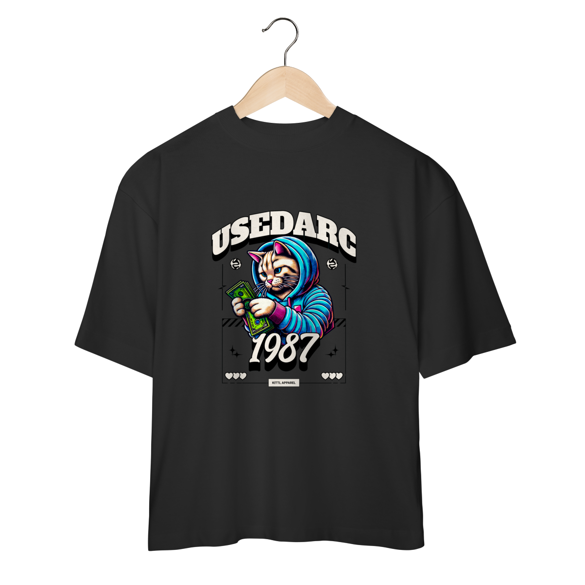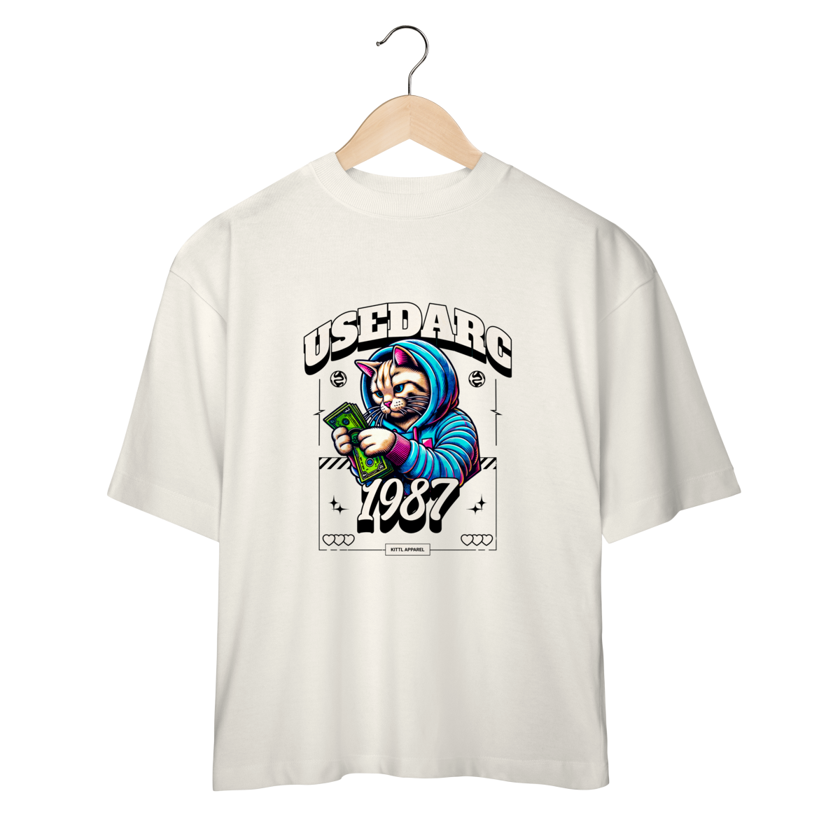 A estampa traz um gato cheio de atitude contando dinheiro, com o nome USEDARC em destaque e o ano 1987, criando um visual marcante, urbano e cheio de personalidade. A peça tem forte pegada streetwear, misturando humor, estilo e referência retrô. Ideal para quem curte autenticidade, atitude e aquele visual que chama atenção em qualquer lugar seja no treino, no rolê ou no dia a dia.