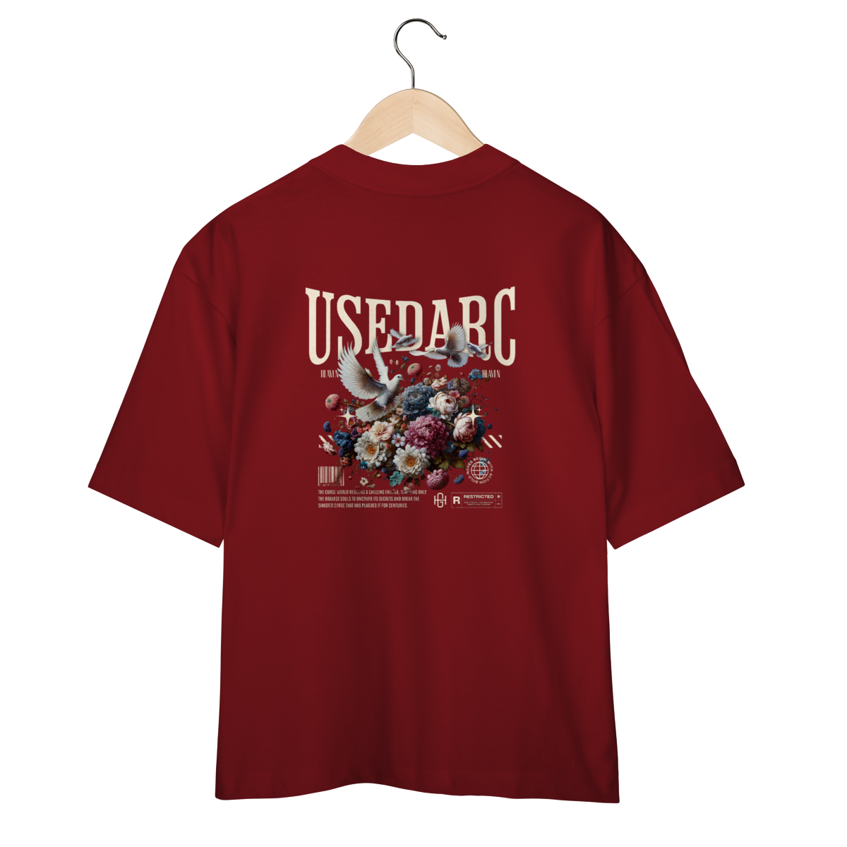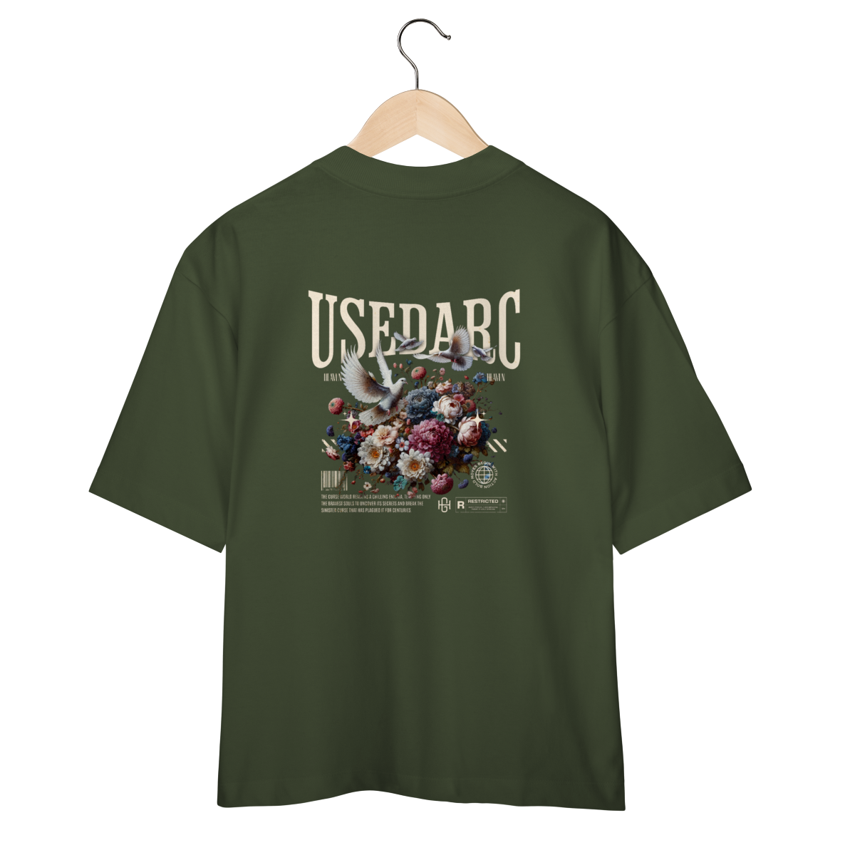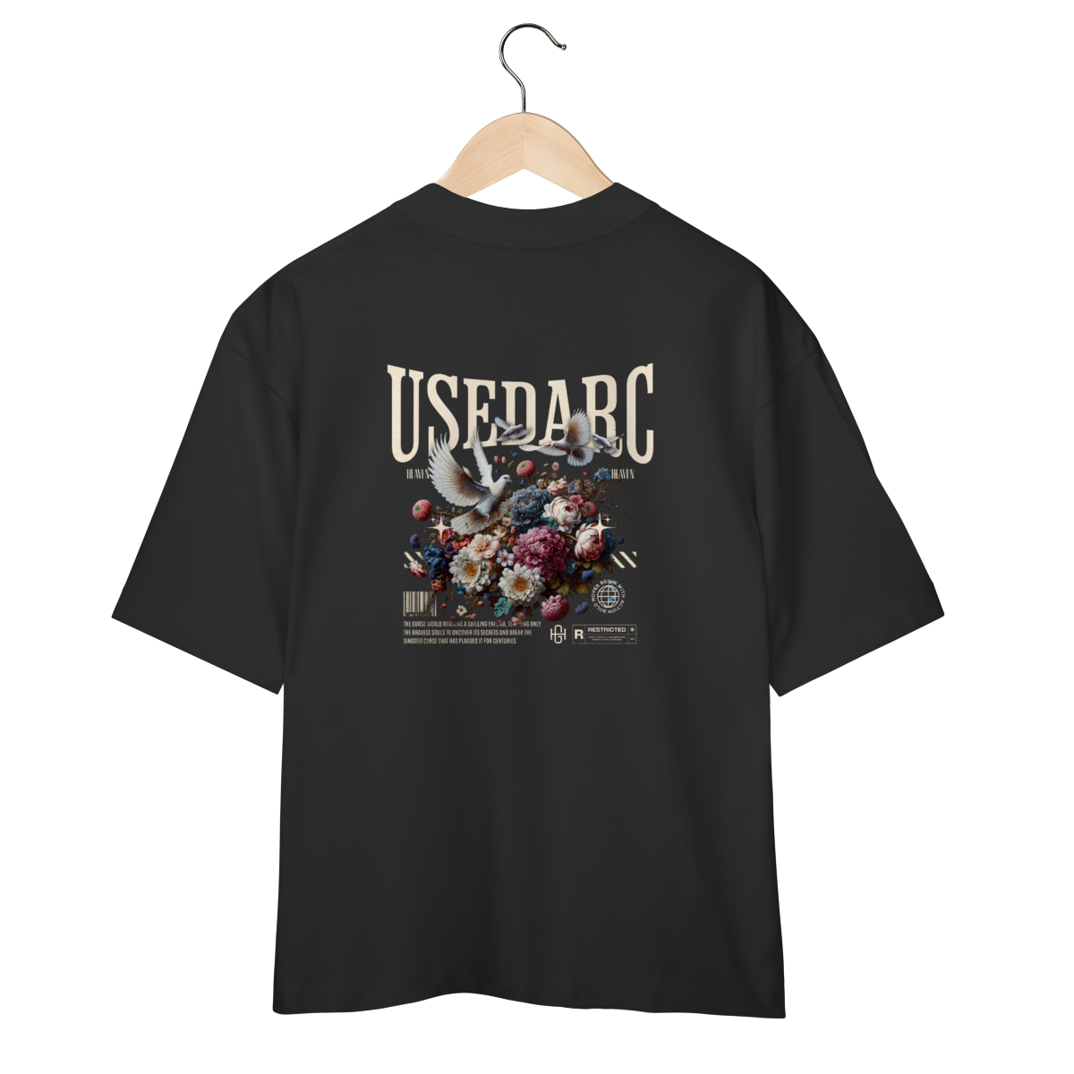 A Camiseta UseDarc Heaven Bloom traz uma composição artística marcante com flores detalhadas e pombas em movimento, criando um visual elegante e simbólico. O nome UseDarc aparece em destaque no topo, reforçando a identidade da marca. A mesma arte é aplicada na frente e no verso, oferecendo impacto visual em todos os ângulos.