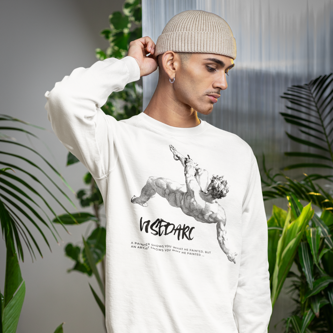 Estampa em estilo antigo retratando um homem caindo de costas, trazendo aquela vibe retrô de pôsteres clássicos. A marca UseDarc posicionada abaixo complementa o visual, unindo nostalgia e identidade moderna. Ideal para quem curte peças com personalidade, referência histórica e estética vintage.